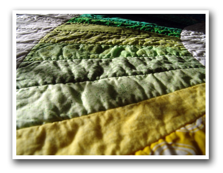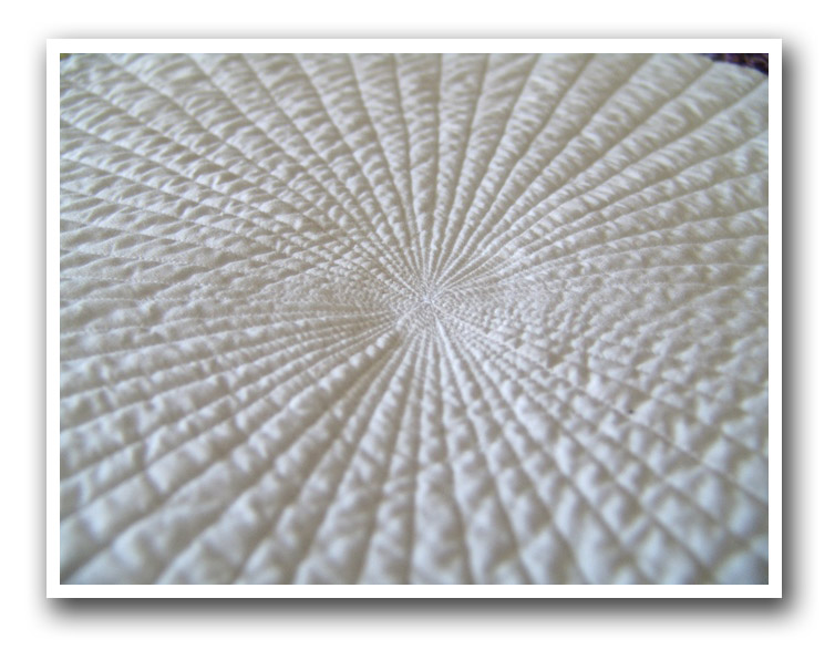 The biggest piece of the work was basting. I did pin basting, but the only place large enough for me to spread it out was my dining room floor (we don't own dining room furniture). There was a lot of crawling around on the floor as I put in over 200 safety pins. It was worth it though as it doesn't have any weird spots that bunched.