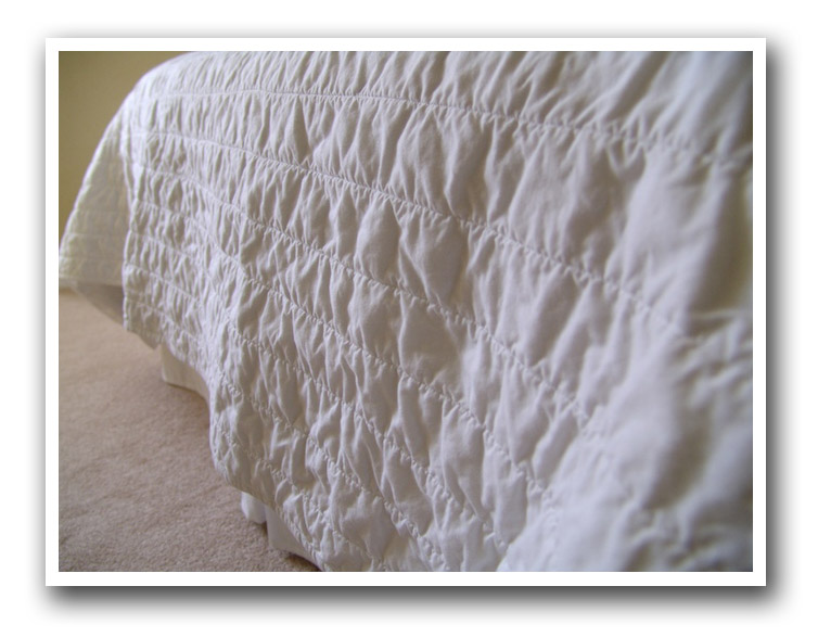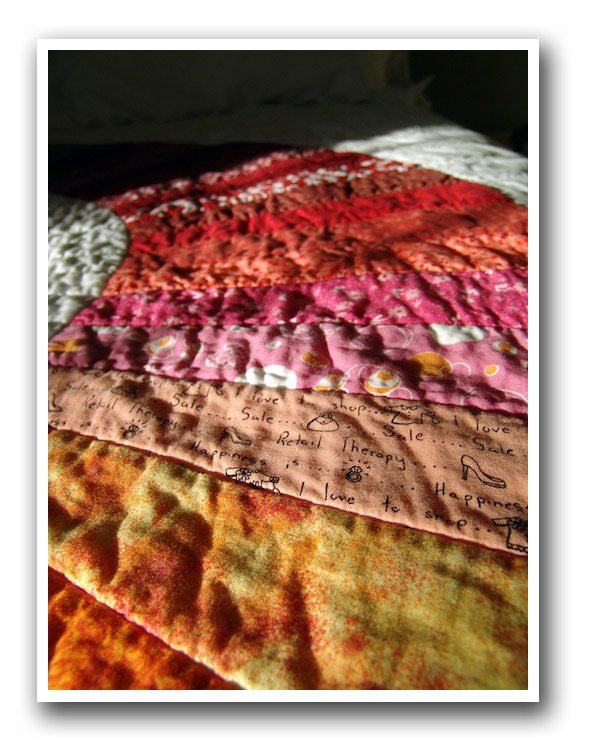 I am so in love with this quilt. I love the colours, I love the pinwheel in the centre, the wrinkles, everything. The original pattern for the quilt is a 56" square. I added some length and width to it so that it would fit over the double bed in my guest room. I think it is the perfect design for this size bed, as it makes the wheel sit right in the centre. Any larger a bed and there would be too much white on the sides. Any smaller and it would hang over.
