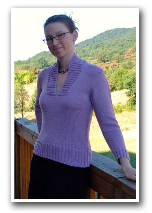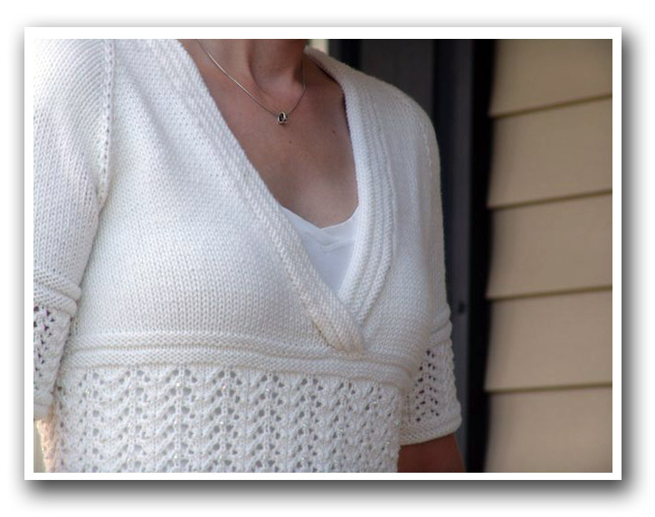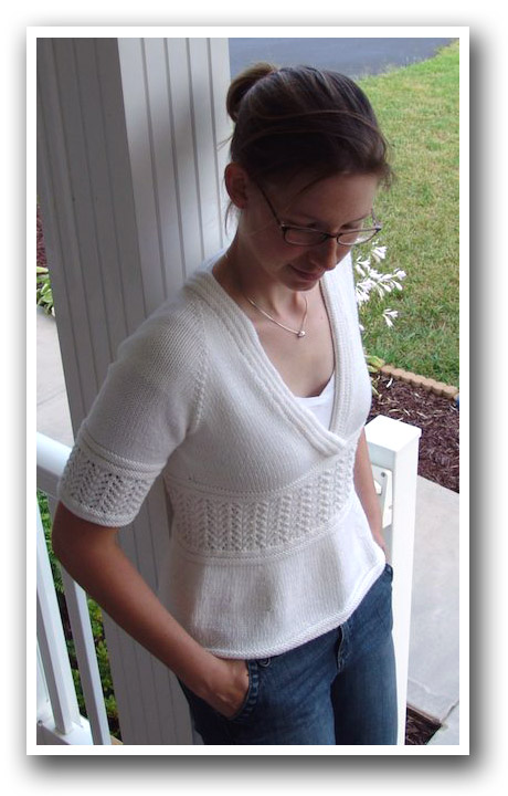 Modifications: Even though my gauge was *exactly* correct, both row and stitch, I knew I was not going to have enough yarn for the sleeves. So I decided that 3/4 sleeves were the way to go. I have very long arms anyway, so I would have had to lengthen them to get them to sit at the right point anyway.