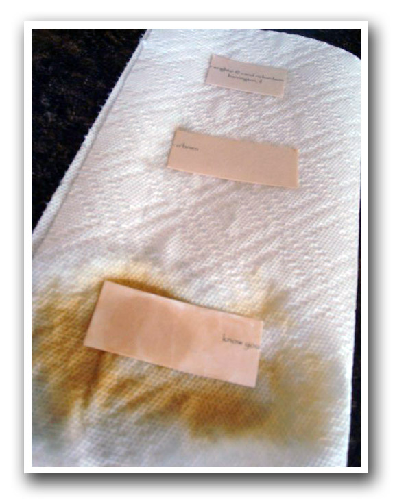 I dropped little pieces of card stock into the tea for various times to test the colour, until I found one that I liked.