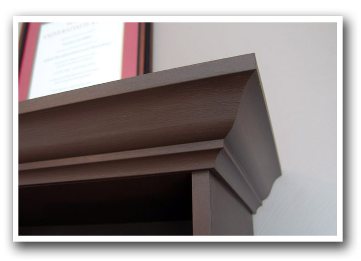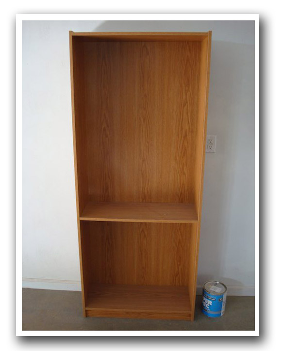 This is one of the good bookshelves, before we started. TJ took the bad shelf, which was a little taller than the other two, and cut off most of the water damage. He also used a few scraps of wood he had in the garage to built it up a little stronger. I then spent several days with the power sander scuffing up the fake wood grain on all three pieces. Then started the first of three coats of chocolate brown paint.