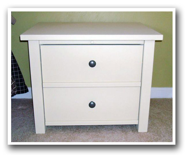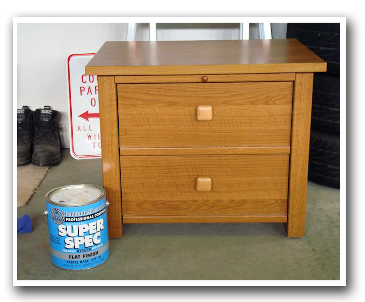 I went to the Habitat for Humanity Restore and bought a gallon of Benjamin Moore paint for $5, and picked up two pewter coloured knobs for $0.50 each. I sanded the fake wood grain with the power sander, and replaced the old knobs.