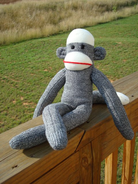 This time I used the red yarn for the mouth, and I really liked that change. I will certainly use the red in the future. Michelle's little one picked out right away that the sock monkey was the same as what was on the quilt (he is a very bright little 4 year old).