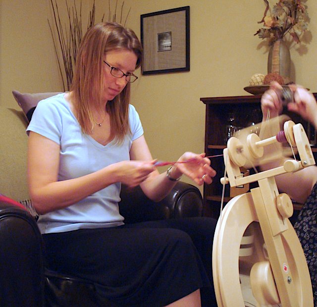 Then, this past Tuesday Nikki, Pam and Stephanie came over to keep me company while I worked on a blanket project (more on that tomorrow). At the end of the night I asked if I could try out Steph's wheel.