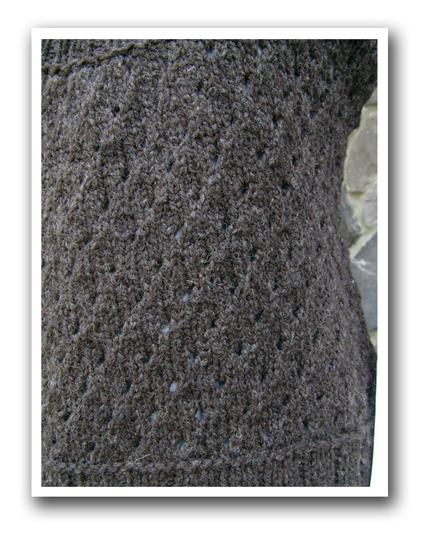Sorry that there are no modeled shots. Truth is, I finished this on June 9th (10 days from start to finish) but it has either been too hot or too rainy to get outside with wool on. So displayed on Charlie will have to do.