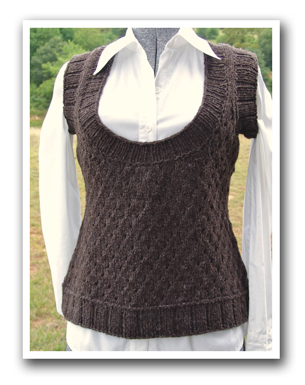 There was a bit too much twist in this yarn, and that in combination with the eyelet pattern made the vest twist a little. I did some very aggressive blocking, and as a result I blocked the hip area out a little too far for my measurements. But that will be easily fixed when I do a little steam blocking with the iron.