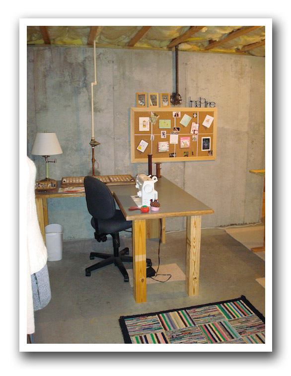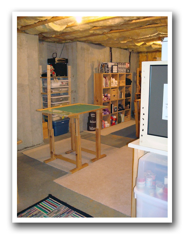 For those who haven't seen it, my studio is in my unfinished basement. There are plans to someday put walls in there, but for now it is concrete and studs. I was really trying to find a way to get the walls put up, but it just wasn't going to happen in the next little while. But you know what? I love it now the way it is. A tour perhaps?