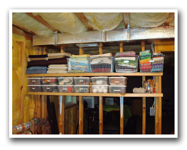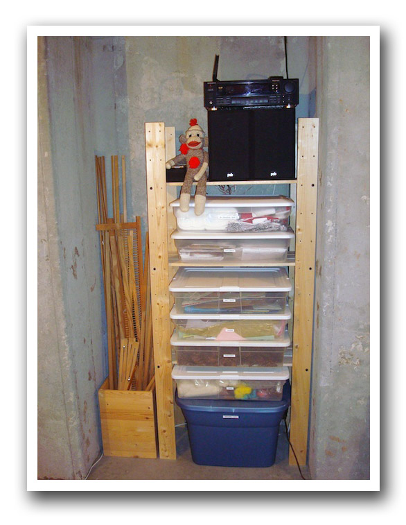 Again, I pulled a ton of stuff off this shelving unit and ended up using it for just these flat totes, which worked great. Everything in the bins was sorted and labeled. All my tall weaving tools are just off to the left there, neatly tucked away.