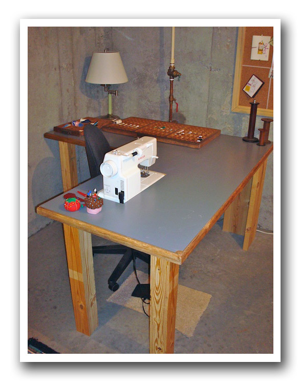 This was the main bulk of my reorganization (this is just to the right as you walk in the door. I am standing where the sewing table is). None of this was here before Friday. T suggested that I needed a countertop to give me more workspace. I went to my favourite store, Habitat for Humanity, and picked up this huge counter for $30. It was even larger then this, but T helped me cut it down. We had the 4x4's for the legs already, and with T's excellent handyman skills I now have a standing height counter for making my cards.