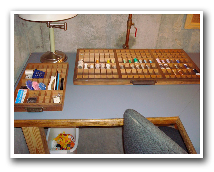 Threads are in one large letterpress drawer and tools are in the little one. Tiny bits of thread, fabric and stuffing go in the pail down below so that I can use it to stuff toys. No sense in throwing it out, right?
