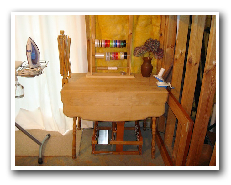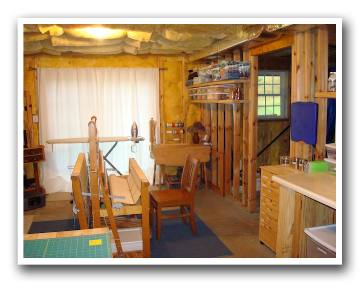 The view as we move counter clockwise around the room - my loom, cutting table with mat (in the bottom left corner) and more shelves: